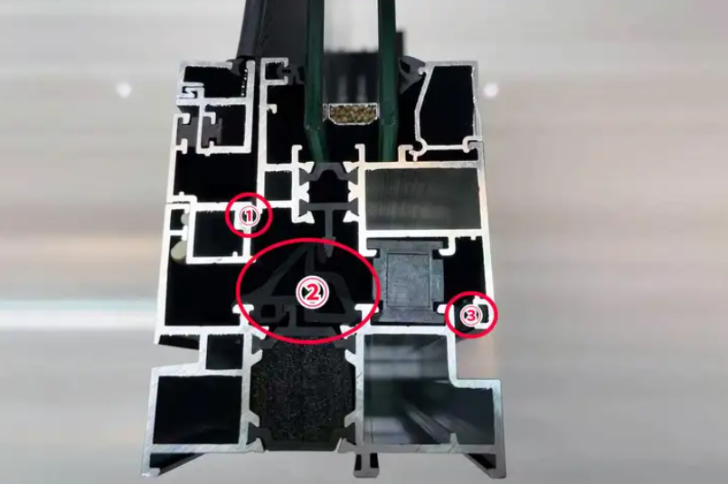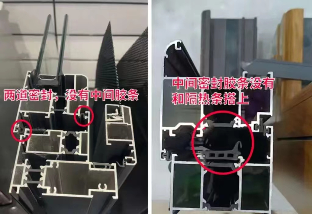 分別是外側(cè)、中間、內(nèi)側(cè),并且中間密封必須是有效的。中間的密封條叫做等壓膠條,像下面這種,等壓膠條沒有和隔熱條或者型材搭接(最理想的狀態(tài)是和隔熱條搭接),那就是一道擺設(shè),實際上還是兩道密封。
